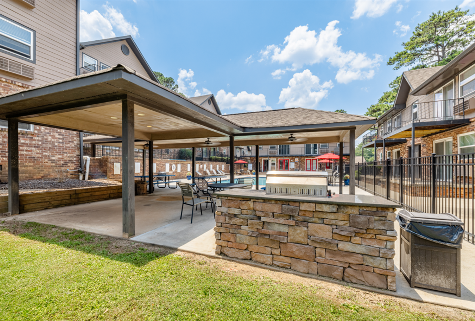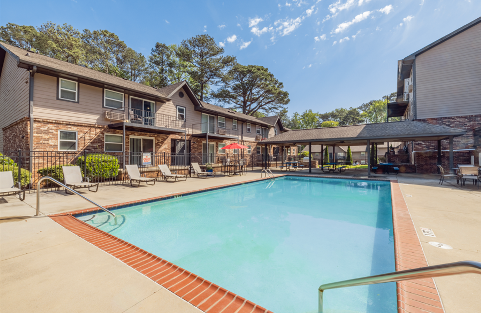 Residents enjoy a welcoming community with everyday amenities including a sparkling swimming pool, on-site laundry facilities, pet-friendly spaces, and shared outdoor areas. Additional amenities are available through nearby sister properties, offering expanded outdoor gathering and relaxation options.